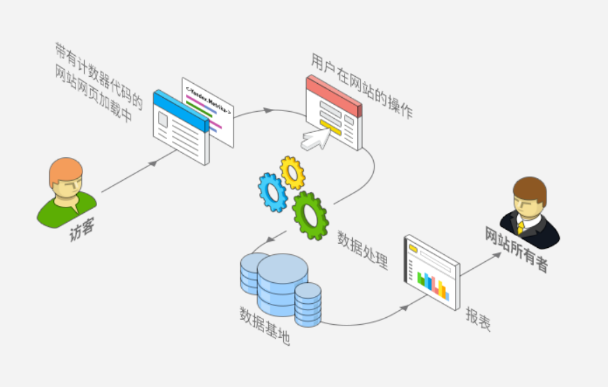 用户通过搜索系统、别的网站的链接、广告链接或者其他方法访问你的网站。在这个过程中,网站的HTML代码加载到用户的浏览器上。如果在网站上安装了Yandex.Metrica的话,那么网站的代码中将会出现Yandex.Metrica计数器的代码。正是这一代码会将用户的操作信息发送到Yandex.Metrica服务器上。