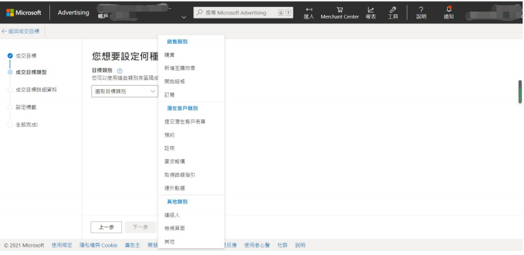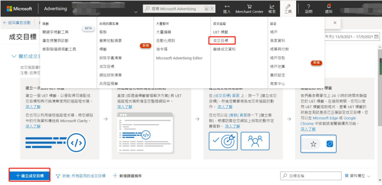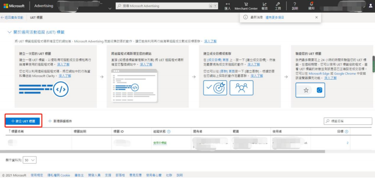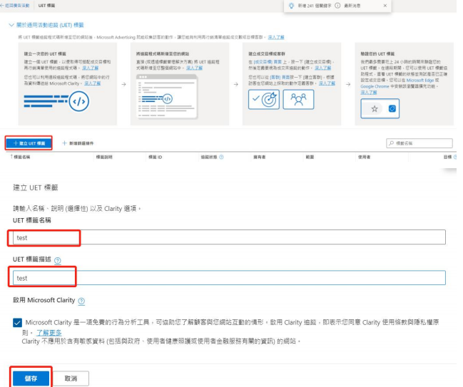 - 如果未创建UET标签,则根据上述介绍自行创建UET标签,填写信息并保存,再复制ID。新账户则要继续根据上述描述,设置成交目标。