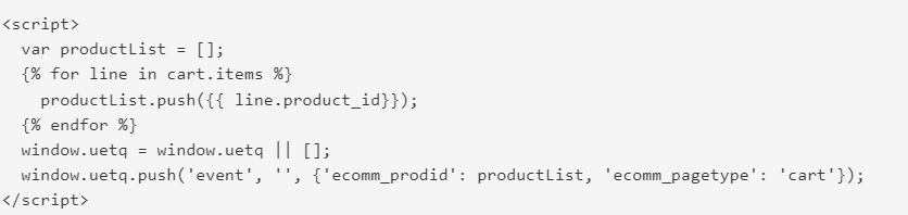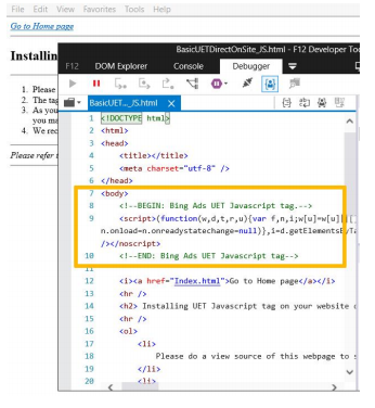 将复制的UET标签跟踪代码粘贴在网站的每个页面上,无论是在头部还是中部。在图像中,UET标签跟踪代码粘贴在网页中部的顶部部分。代码添加好后即可设置成交目标。
