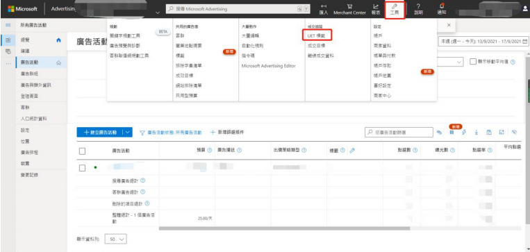 - 从页面顶部的菜单选择工具,然后选择UET标签,在表中查看列。