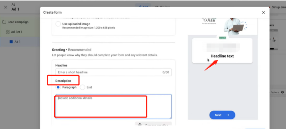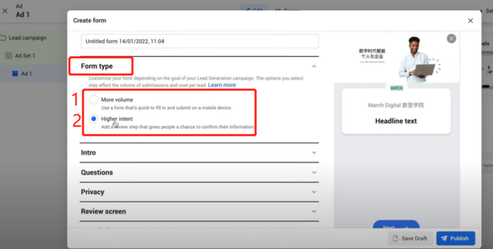如果你想要你的用户认真填写你的表格,建议选择第二种High intent(高意图)类型,它可以让你多设置一些问题来测试填写表格的用户是否属于你的目标客群。