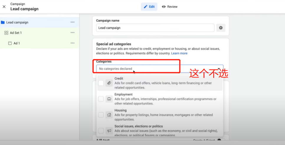 Step 4:找到Campaign objective,如果你想做A/B测试可以点击勾上,不需要就跳过。