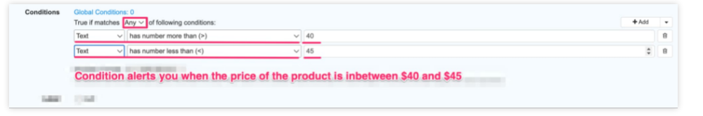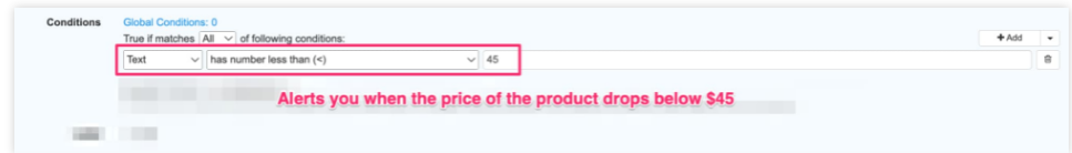 9.要获得特定价格下降的警报,您可以在监视器中添加条件。这确保了Distill对产品价格运行逻辑条件检查,并在条件为真时提醒您。