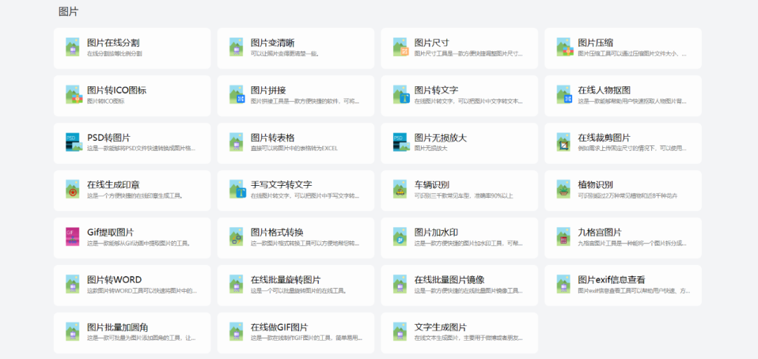包括图片在线分割、图片变清晰、调整图片尺寸、图片在线压缩、图片转ICO图标、图片拼接、在线人物抠图、PSD转图片、图片转表格、图片无损放大、Gif提取图片、图片格式转换、图片加水印等功能。