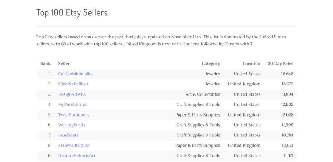根据过去 30 天的销售额计算的Etsy顶级卖家,Marketplace Pulse专注收集电子商务市场的数据,还适用于Amazon、eBay、Etsy、Walmart、Wish 等电商平台。