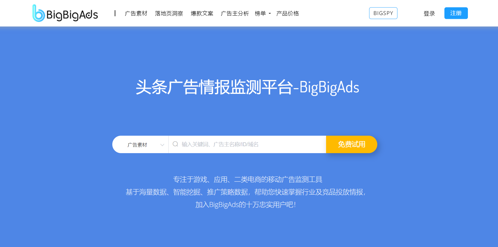 BigBigAds是一家广告情报分析领先者,成立于2014年,总部位于上海。截至2022年9月,BigBigAds已经累计抓取游戏类素材超过425万,应用类素材超过3240万,电商类素材超过5637万,为广大优化师朋友提供了海量的创意想法。同时,BigBigAds还覆盖国内主流媒体广告平台,例如抖音、头条、微信、百度信息流、西瓜视频等等平台。