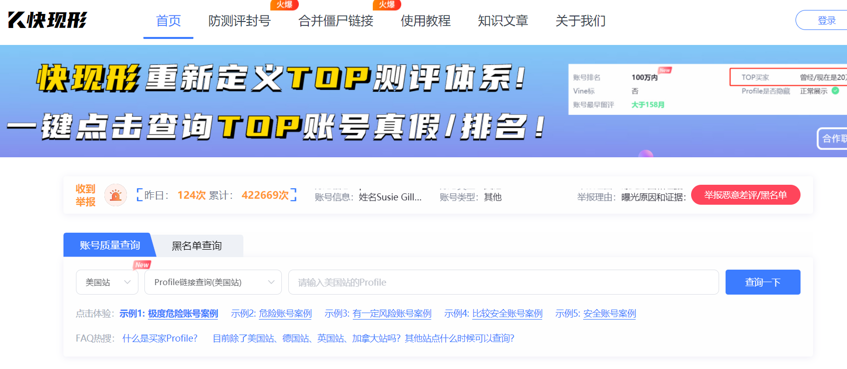 另外,现在活动期间使用快现形可以免费查询,帮你快速甄别出你的买家问题账号,从此放心测评。举报打标系统一直免费,全力服务卖家。更值得一提的是,快现形有美国技术支持,核心团队来自美国西雅图,有7年以上亚马逊买家数据分析经验,能够实时分析亚马逊买家账号的各种风险。