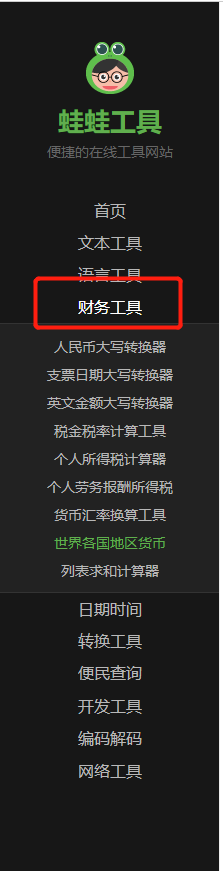 今天主要说的货币符号查询功能,在蛙蛙工具的财务工具分类当中。