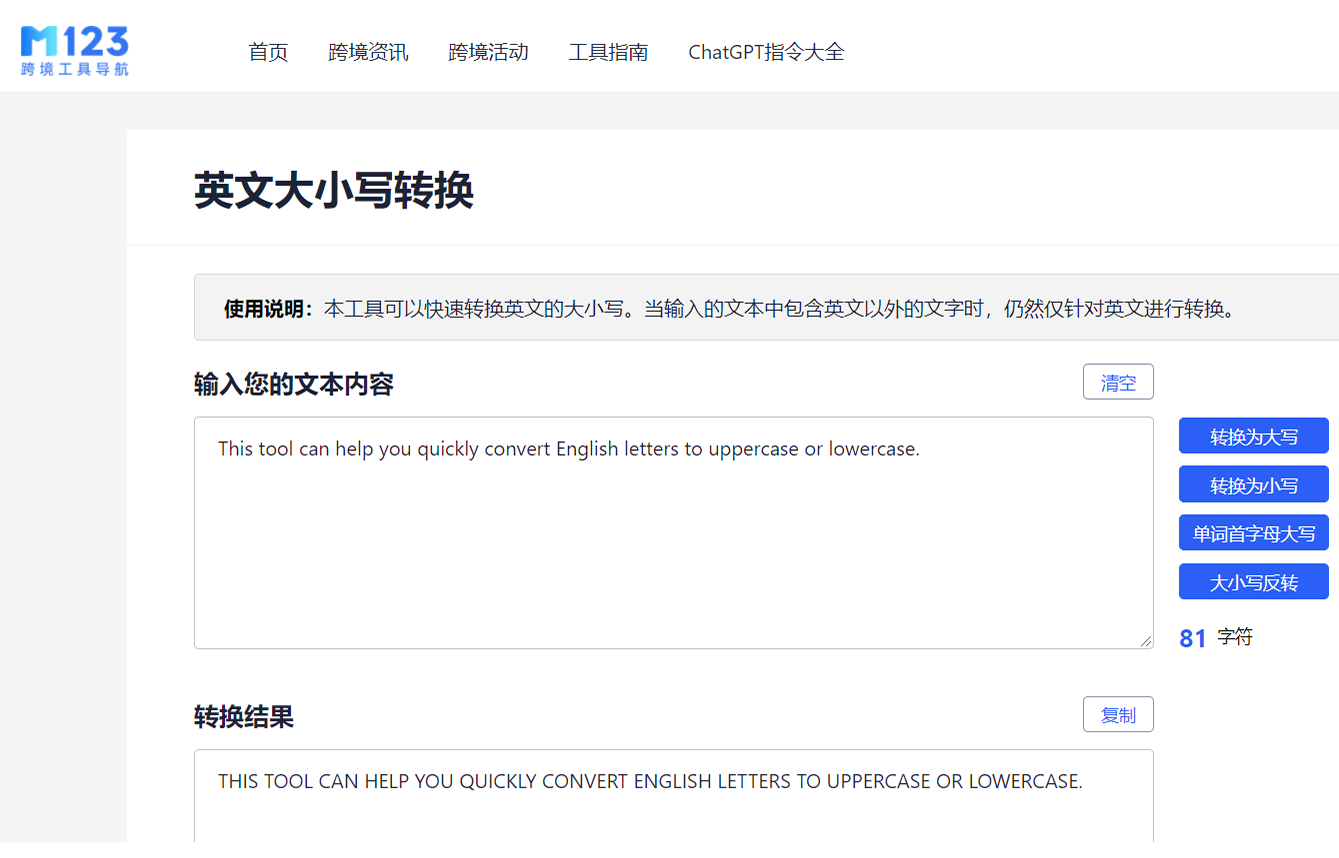 使用该工具非常简单,只需前往M123跨境工具导航平台,搜索“英文大小写转换器”,点击链接进入工具界面