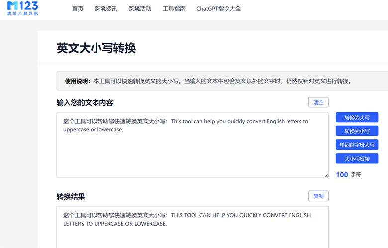 M123跨境工具导航平台的英文大小写转换器是跨境卖家必备的工具之一。我们的工具完全免费,实用性强,易于操作,无需下载安装,是解决英文大小写转换难题的便捷体验。与其他同类工具相比,我们的优势在于免费、实用、易用和方便。做跨境就上m123.com,让出海更简单。
