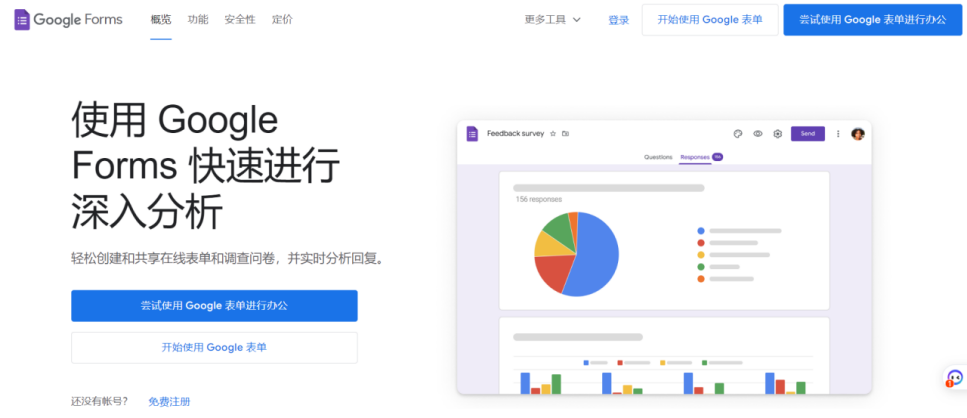 Google Forms是一款免费的在线表单创建和调查工具,它可以帮助用户快速创建各种类型的表单,包括问卷调查、报名表、反馈表等。用户可以根据需要添加题目、描述、选项等相关信息,并设置表单的样式和主题。在收集数据时,用户可以选择将表单链接发给受访者或嵌入网站,也可以设置多种不同的表单验证方式(如验证码等)。在数据收集完成后,用户可以在Google Forms中查看数据统计和分析结果,并使用Google Sheets等其他工具进行更深入的数据处理和展示。