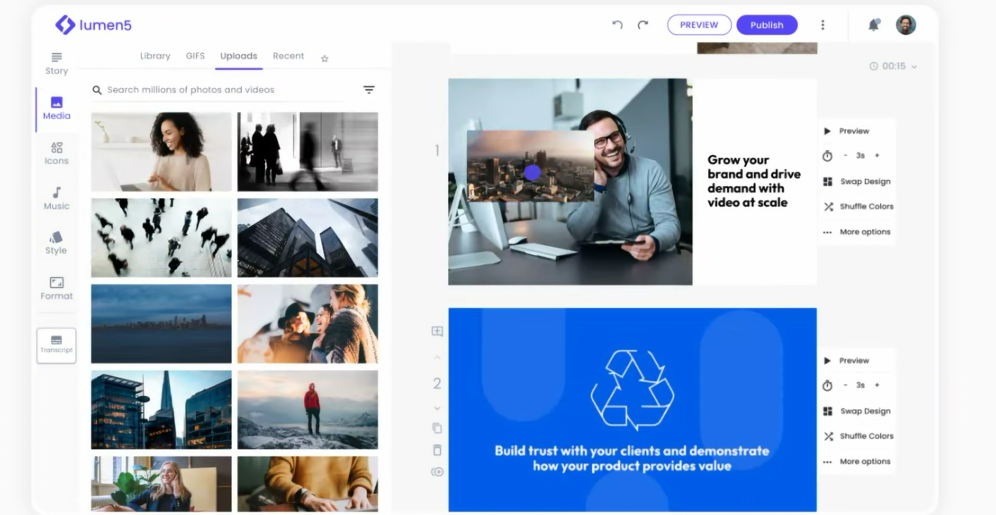 视频制作和营销平台(点击查看详情页)已经成为了营销中不可或缺的重要工具。为了更好地满足企业在视频制作和营销方面的需求,人工智能技术日益成熟,lumen5视频制作和营销平台(点击使用工具)应运而生,它是一款强大的云服务平台,提供多种基础工具和辅助功能,帮助企业实现高效的视频制作、编辑和营销推广。