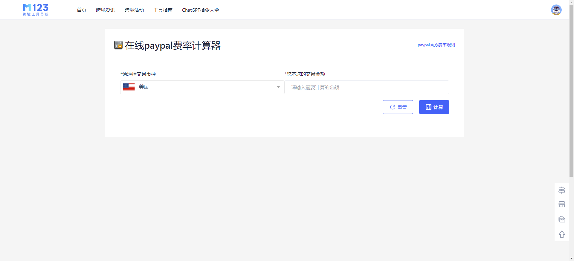 (产品落地页:https://www.m123.com/tools/paypalonline)支持在线计算美、日、英、法、德等共8个国家的paypal手续费,同时计算paypal转入和转出费用,展示当前费率规则。