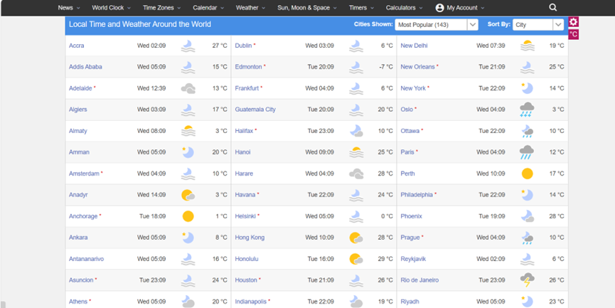 将鼠标悬停在任何红点上可查看城市和国家的名称以及当前当地时间。如果当前有夏令时,则显示“DST”。单击任何红点,然后转到该城市的页面,其中包含时间,天气,日出/日落,月相等等。