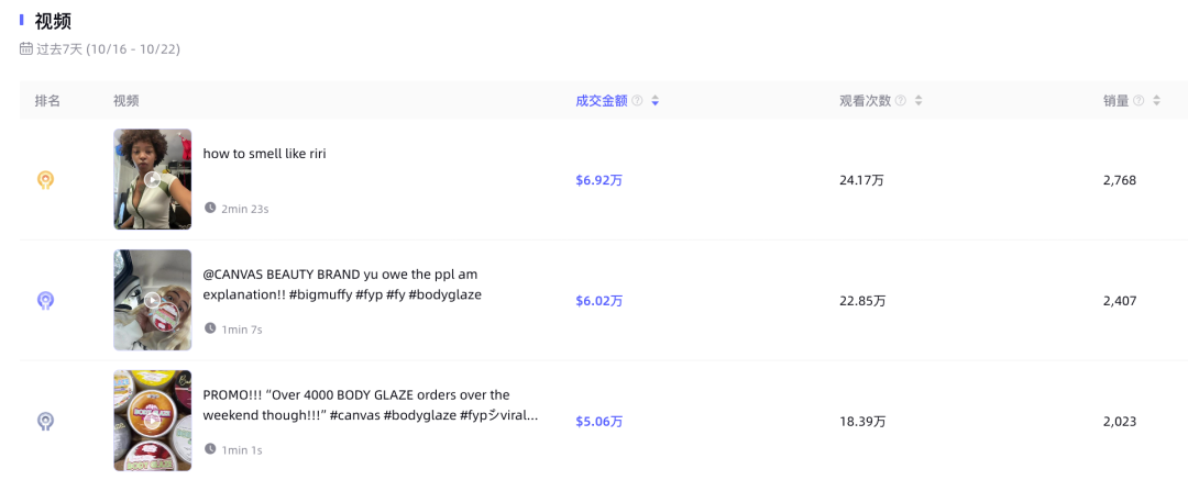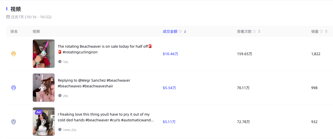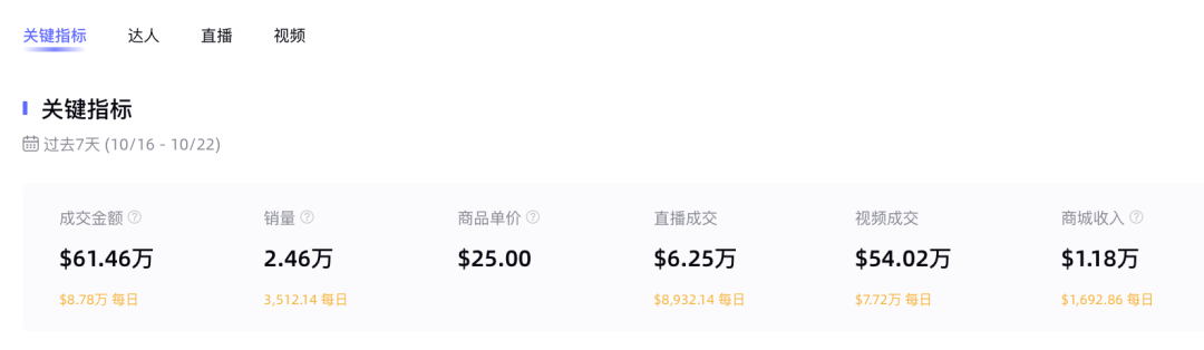 从Kalodata关键指标数据可以看到本款产品7天共销售了2.46万件,共创收61万美元,其中直播成交6.25万美金,短视频渠道收入54万美金,占总收入的87%;