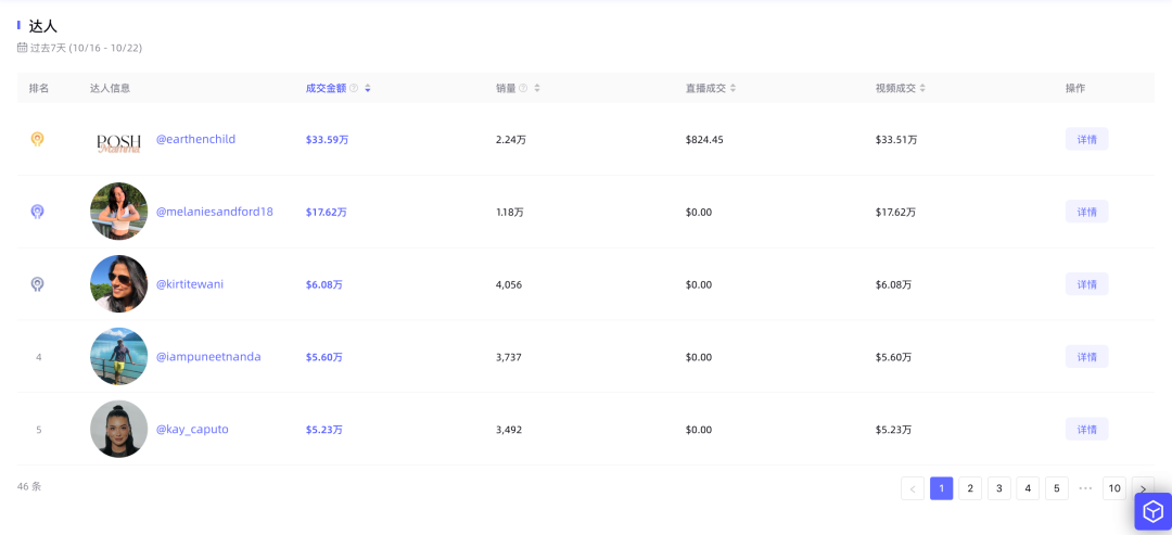 直播方面,该产品共关联80个达人账号,开播共13场,其中销售最高的单场直播共卖出5.45万美金,该场直播从晚上19:04开始持续至晚上19:34,直播时长仅29分钟,整场直播共卖出2180件产品,平均每小时的直播收入为11w美金左右,每小时的产品销量为4360件。
