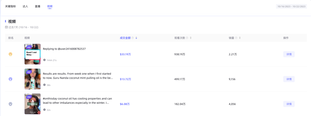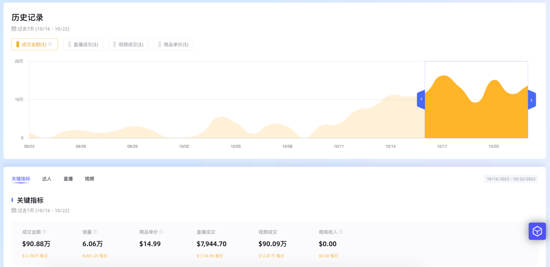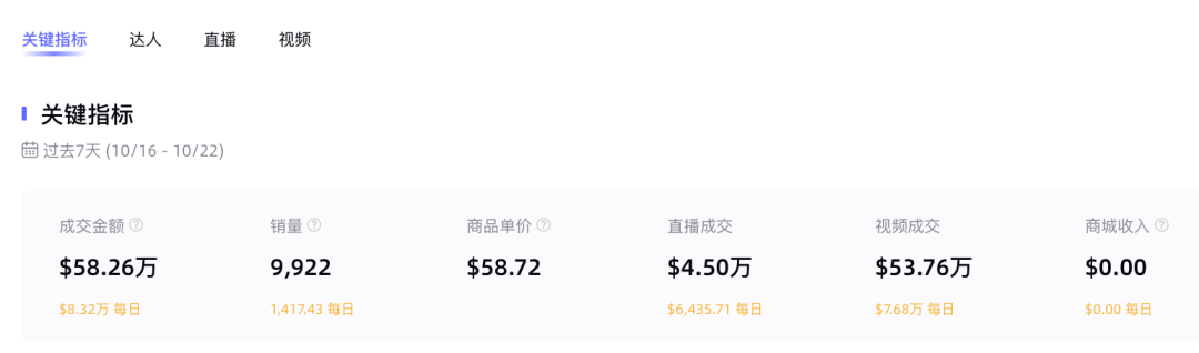 从Kalodata关键指标可以看到,该产品上周热度减退,但是依然有58万美元的成交额,共卖出9922件产品,收入来源主要是短视频成交,短视频占总收入的92%,短视频成交53.76万美元,直播成交4.5万美元。