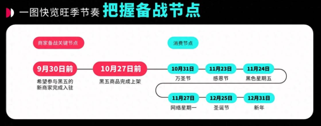 为了让跨境商家更好地参与这次黑五大促活动,TikTok Shop官方发布了一份时间表。根据这份时间表,有意向参与黑五大促的跨境商家需要在9月30日前完成入驻,10月27日前完成商品上架。