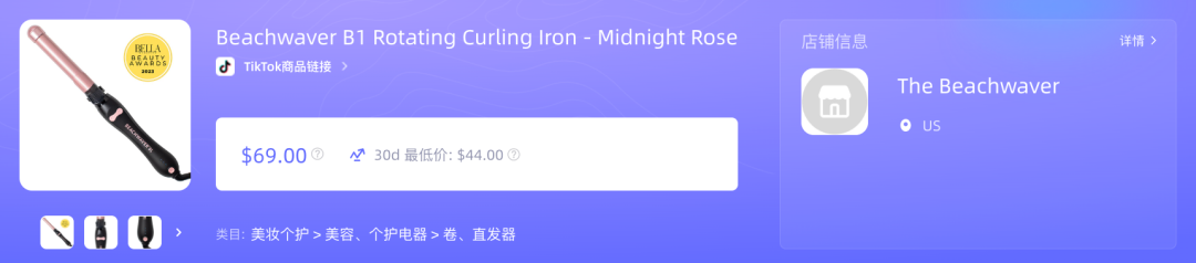 从趋势图可以看到,这款产品一直都有不错的成交额,在上上周势头猛增,一跃成为TikTok美国热销商品周榜第7,本周更是直冲热销商品榜榜一。