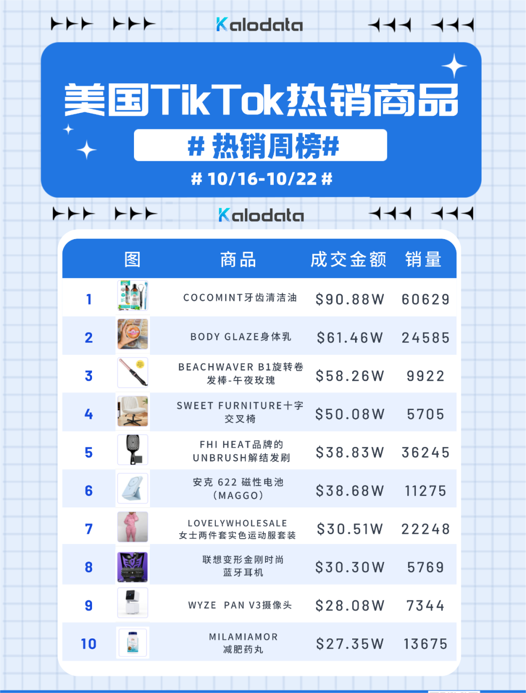 那么应该挑选哪些商品上架呢?让我们一起来看看上周美国TikTok小店的热销商品都有哪些吧!