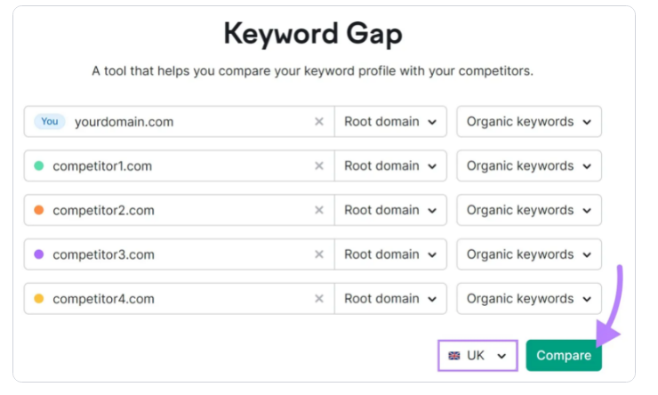 首先,输入你的域名和最多四个竞争对手的域名。然后,选择您的国家(在本例中是英国),并单击“比较.”