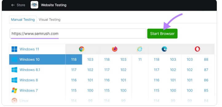 然后,选择要检查的操作系统、浏览器和浏览器版本。然后点击"开始 浏览器.”