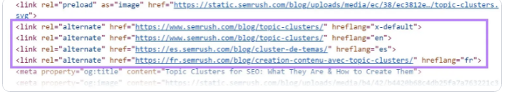 2.将hreflang属性添加到每个页面的HTML代码中。它通常放在< head >中,包括所有替换页。下面是它希望为美国用户编写的英语页面和为西班牙用户编写的西班牙语页面: