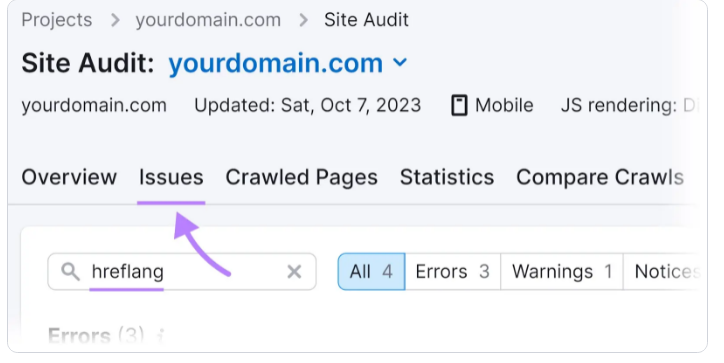 该工具对您的网站进行爬网后,请转到“问题“拉环。并在搜索栏中键入“hreflang ”: