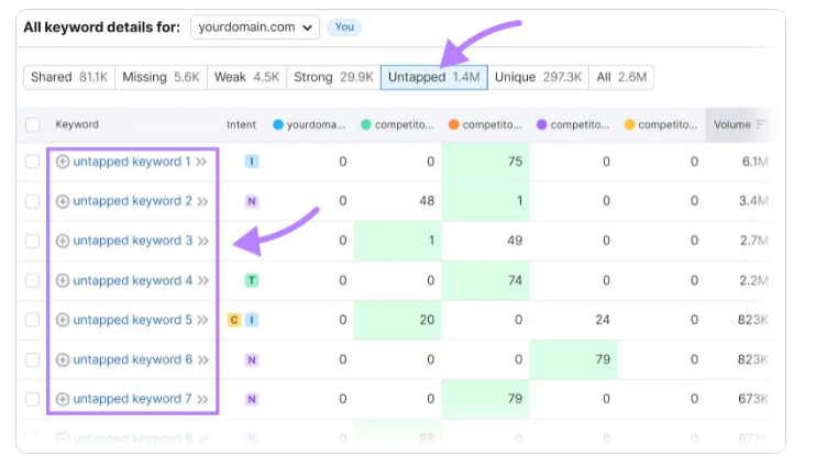 如果你刚刚开始,试着研究一下不同市场中你的竞争对手在使用哪些关键词关键词间隙.