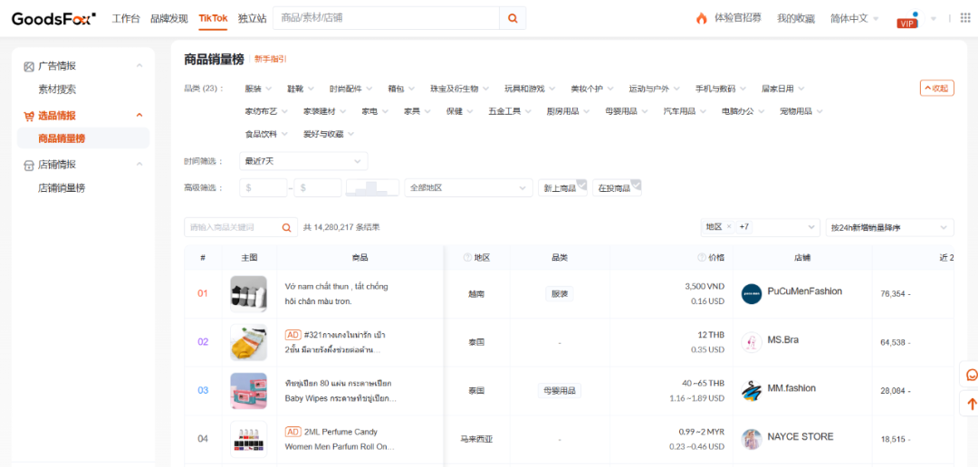 ①通过 GoodsFox 的TikTok 商品销量榜进行查找。该功能提供 TikTok 平台上的商品销量排行,并且精准追踪到商品每日的销量变化,帮助您轻松判断商品是否具备跟品、跟卖潜力 。