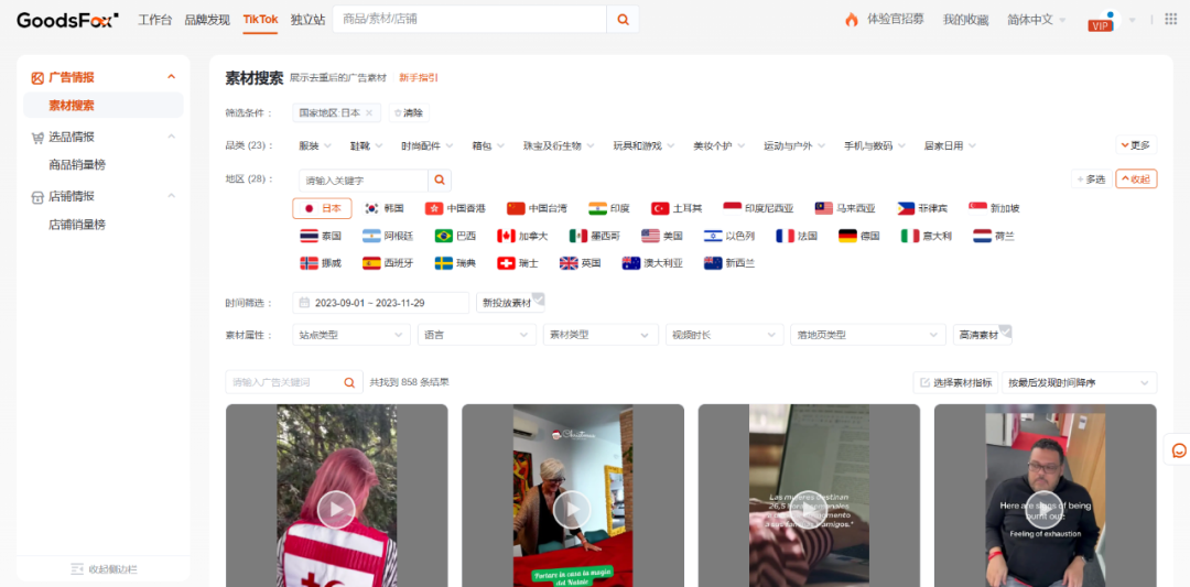 分析广告素材表现:通过最新最热的海外广告库素材,根据多条件(品类、地区、时间、站点类型、语言、素材类型、视频时长、落地页类型等)筛选对标广告,获取精准的选品方向,实时挖掘具有潜力的爆款商品创意,快速定位市场需求。