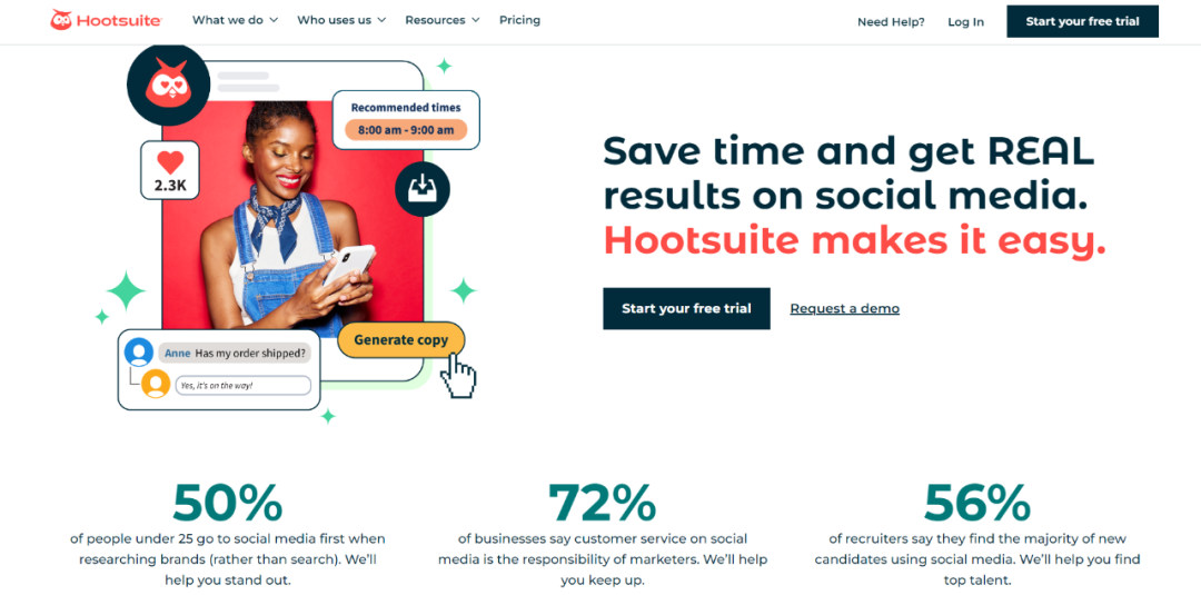 Hootsuite是最全面综合的社媒管理工具之一,可以有效及时地发现受众的一些评论、疑问和信息,并及时地回应他们,随时随地掌握社交媒体账户,高效便捷地管理多个平台。可以帮助营销人员轻松地管理多个社交媒体账号,并定时发布和互动,提高品牌曝光率和用户互动性。