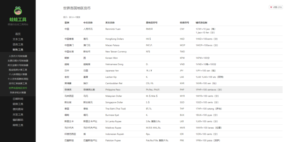 今天主要说的货币符号查询功能,在蛙蛙工具的财务工具分类当中。