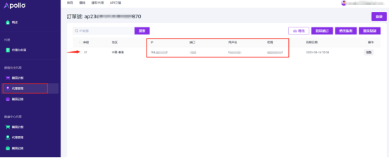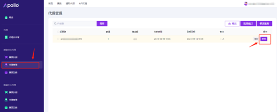 2.找到左侧导航栏中的代理管理,打开代理管理,您可以看到您购买的订单,点击右侧管理按钮