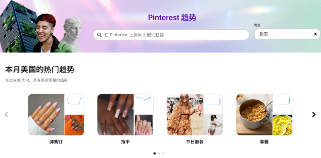 Pinterest Trends是Pinterest提供的趋势分析工具,能够帮助用户了解Pinterest上的热门话题和趋势,以及相关的搜索量和用户兴趣。Pinterest Trends对于图片内容和用户兴趣的数据分析,可以为我们提供更具体和有针对性的趋势分析结果。