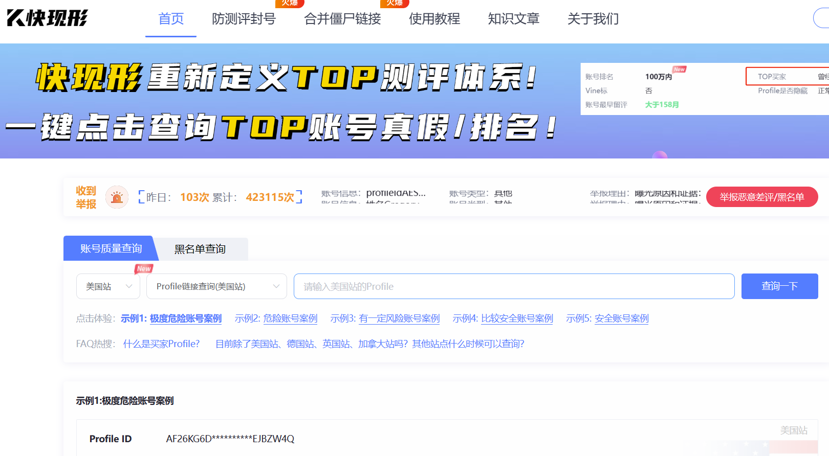 快现形是一款跨境账号征信平台,可以帮助企业第一时间甄别买家账号的安全性,并迅速确认账号是否存在问题。同时,快现形还可以曝光骗子账号和中介服务商骗子,让企业及时了解市场动态,降低运营损失。