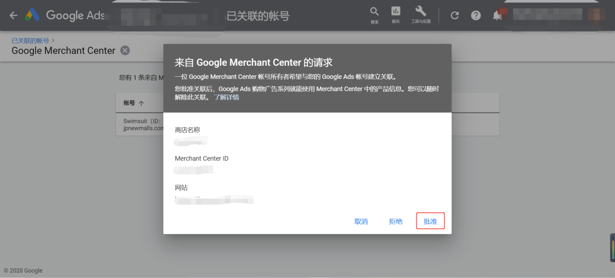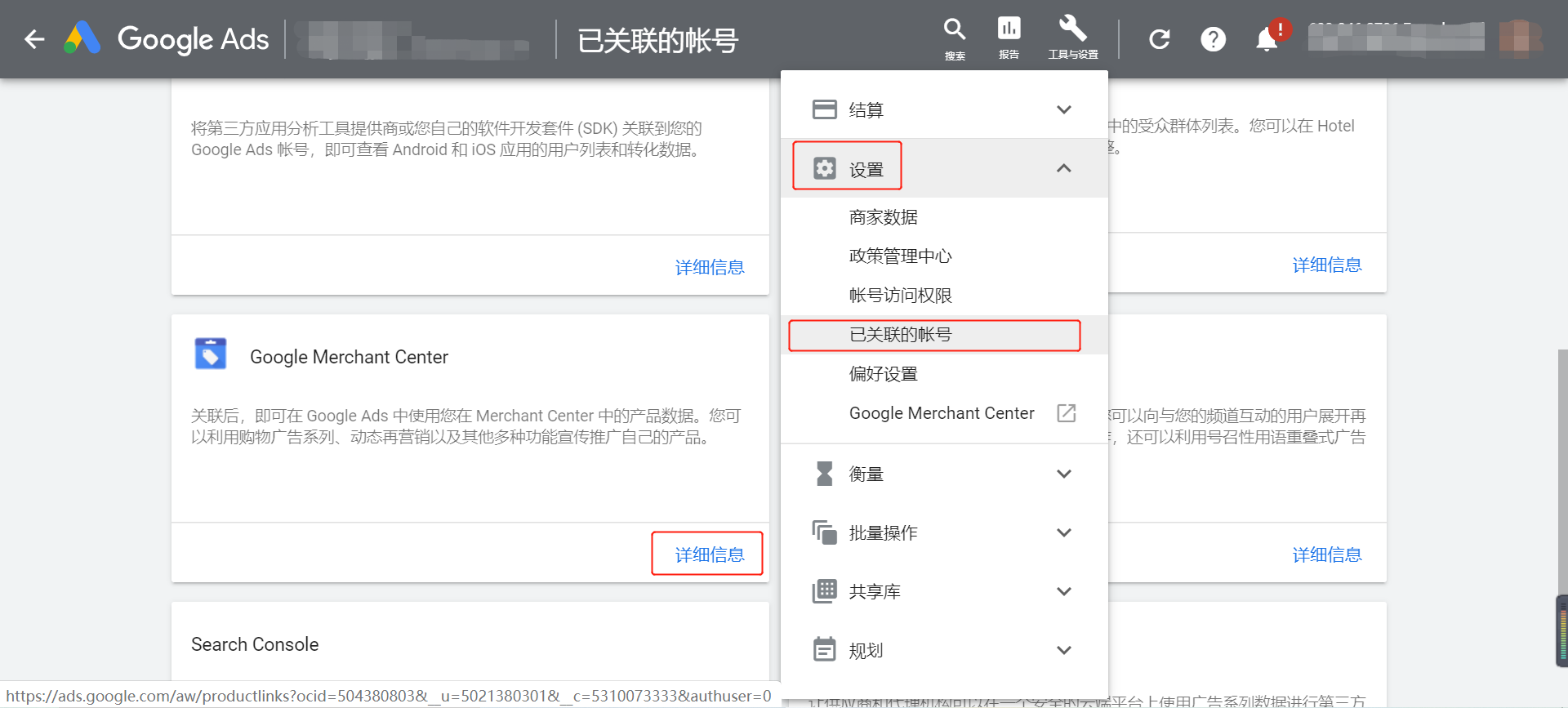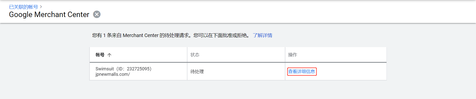 再至Google Ads中,依次点击设置-已关联的账号-gmc详细信息-查看详细信息-批准(注:请选择你要联结的gmc的id号进行批准)