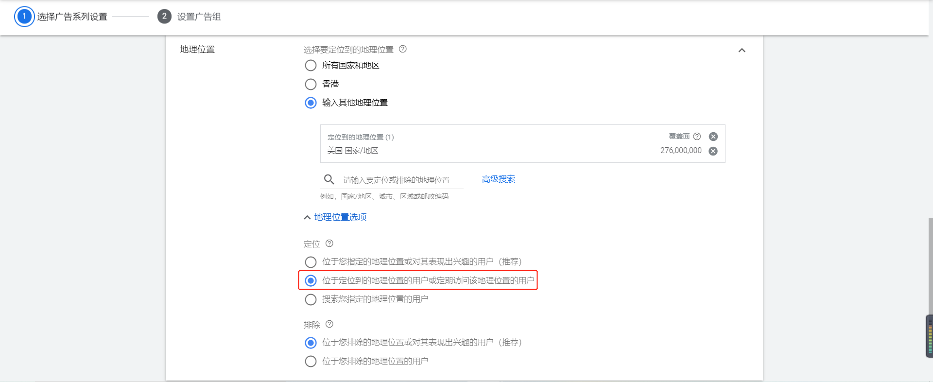 (四)广告系列设置。进行广告系列命名-选择每次点击费用人工出价(默认)-填写预算-定位至搜索网络(注:一般不选择YouTube、Gmail和Google搜索)-进行地理位置设置(注:定位选择第二项)-保存并继续。