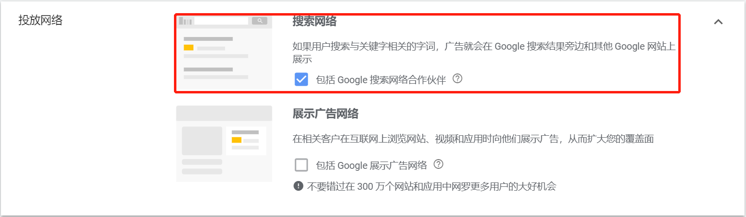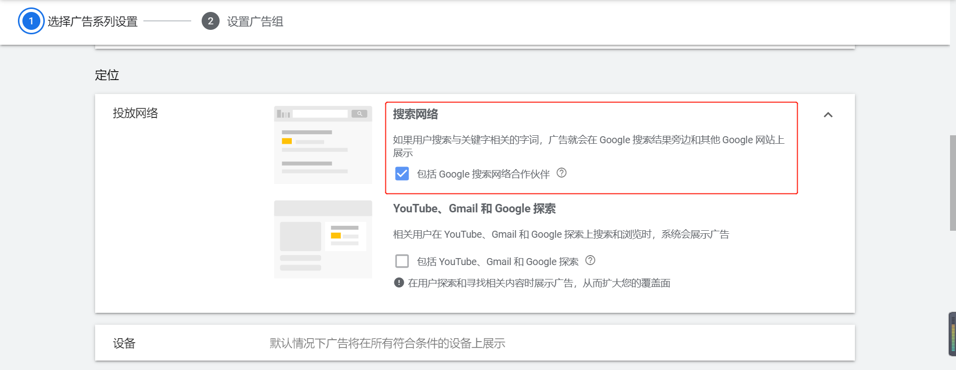 3、填写广告系列名称,投放网络选择搜索网络(包括谷歌搜索网络合作伙伴)注意:展示广告网络不要选。