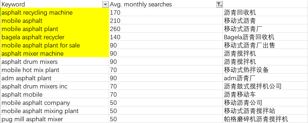 6、利用排序工具,对平均月搜索量数值进行排序,筛选出其中相对搜索量较多的关键字,对照右侧翻译栏,对关键字进行斟酌和考量,避免关键字有歧义
