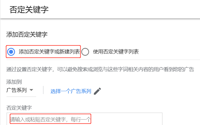选择关键字—否定关键字—添加,新建否定关键字列表