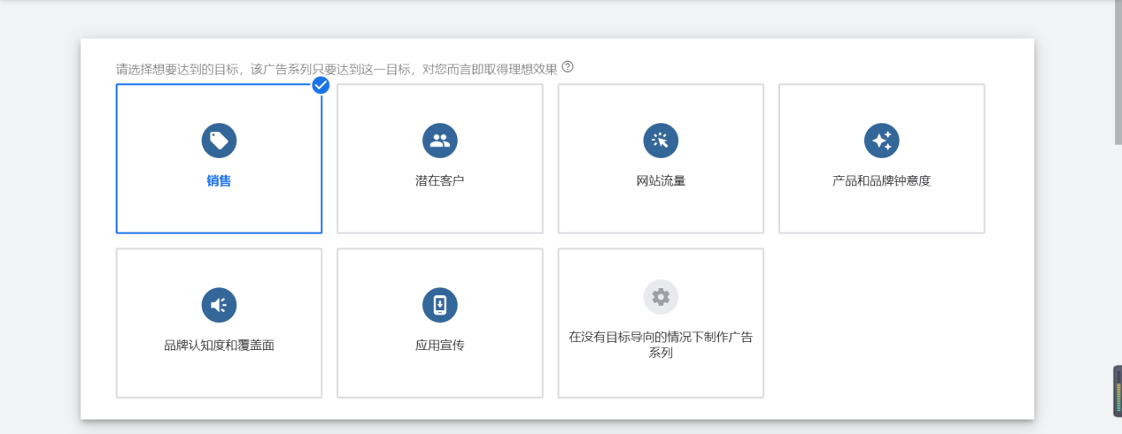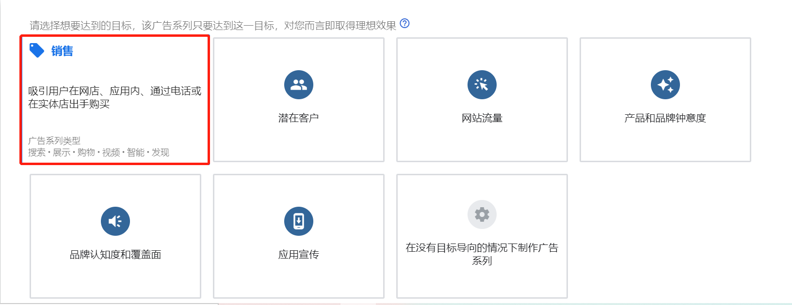 2、选取目标销售和类型搜索广告系列,保存并继续。