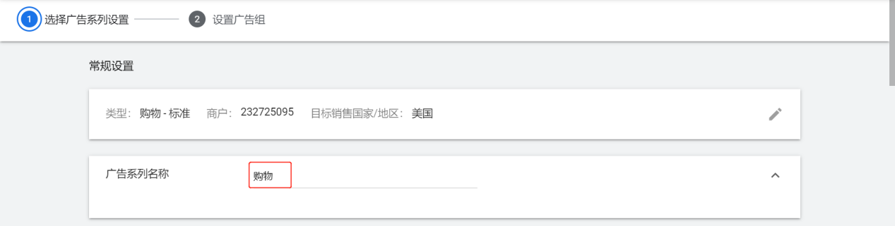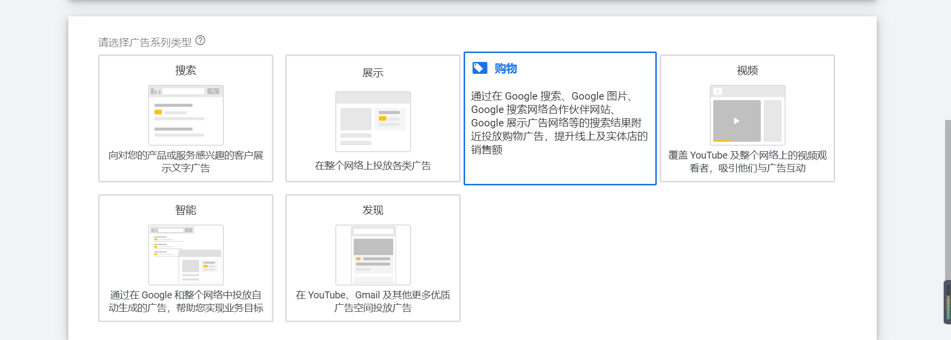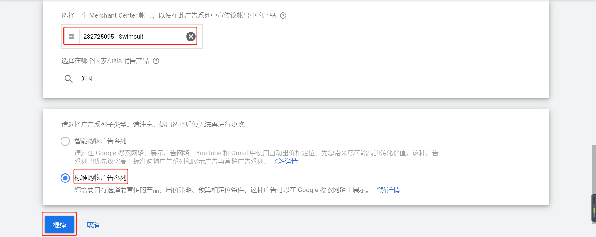 (三)在Ads中,点击“+新广告系列”-选择目标-广告类型(购物)-需绑定的mc账号-标准购物广告系列-继续;