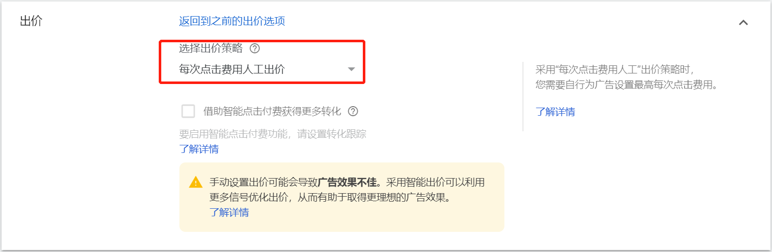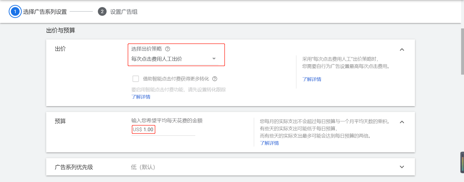 5、设置预算,出价方式选择每次点击费用人工出价,保存并继续。