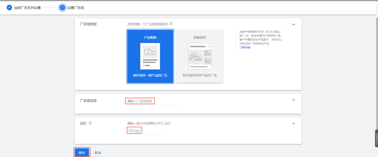 (五)进行广告组设置,选择广告组类型(默认产品购物)-输入广告组名称-填写出价-点击保存