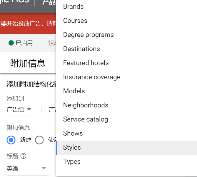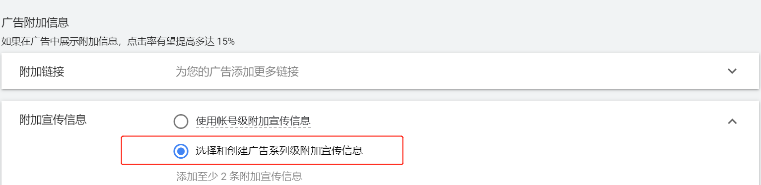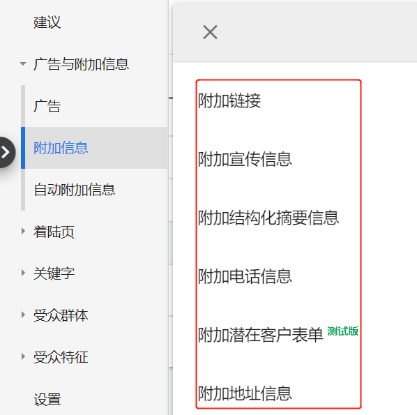 (1)登录谷歌账号,点击广告与附加信息-附加信息,选择您要添加的附加信息。
