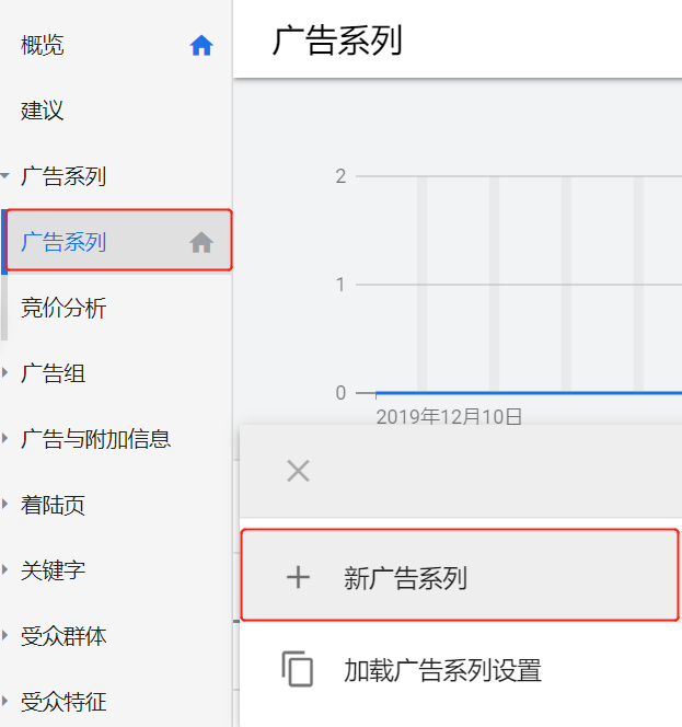 1、登录Google账号,点击广告系列,选择“+新广告系列”。