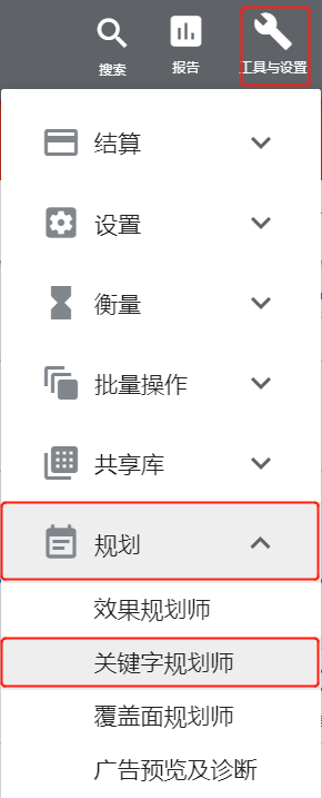 1、登录您的谷歌账号,点击右上角工具与设置一栏,选择规划—关键字规划师。