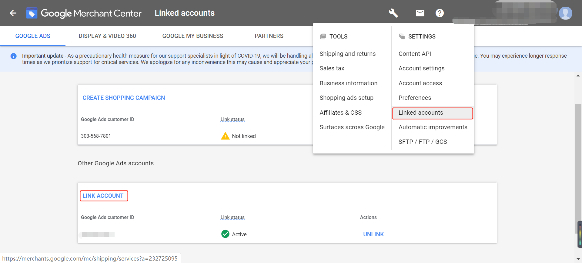 (二)将google merchant center与google ads关联。在gmc账户中点击link account,将您的google ads的客户id号输入并点击链接;
