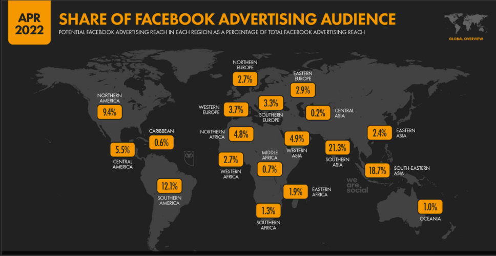 正如前文提到的那样,Facebook 的使用群体数量庞大,当然使用者组成的分布更是遍及全球,具体可参考下图DataReportal发布相关图表。